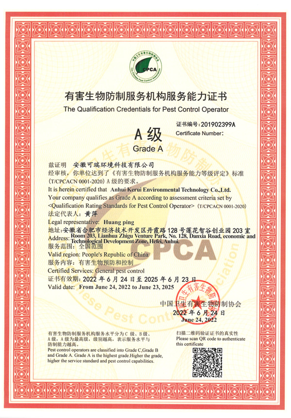 凱瑞蟲控是安徽可瑞環(huán)境科技有限公司旗下品牌,安徽可瑞環(huán)境科技有限公司成立于2014年,注冊(cè)資金500萬(wàn)元,全國(guó)A級(jí)資質(zhì),致力于蟲害風(fēng)險(xiǎn)管理并提供蟲害消殺、防疫消毒、有害生物防制、蟲害控制管理與監(jiān)測(cè)、衛(wèi)生防疫消毒、商業(yè)清洗清潔服務(wù)、空氣治理服務(wù)、環(huán)境綠化施工與養(yǎng)護(hù)、藥品和器械銷售、技術(shù)咨詢與培訓(xùn)等業(yè)務(wù)的服務(wù)性公司。公司是一家有行業(yè)資質(zhì)、注冊(cè)商標(biāo)及專利的公司。我們不參與各種擾亂市場(chǎng)秩序的低價(jià)競(jìng)爭(zhēng),堅(jiān)持以合理的價(jià)格、新穎的設(shè)備、優(yōu)質(zhì)的技術(shù)、完善的質(zhì)保體系和質(zhì)保措施,來(lái)對(duì)客戶進(jìn)行綜合的服務(wù)工作。公司本著...